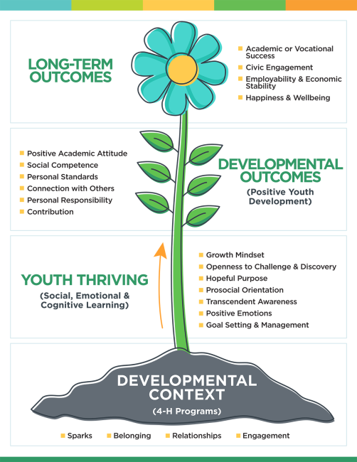 The 4-H Thriving Model is based on three key parts that help young people grow and succeed as adults: