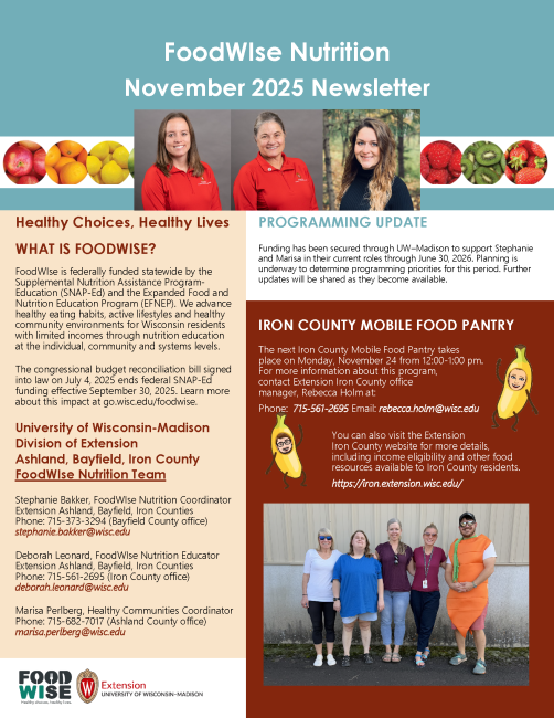 We are happy to share that we are now offering an Ashland/Bayfield/Iron County monthly FoodWIse newsletter. Based on feedback from partners, we are providing a monthly offering that includes nutrition education, local information on food resources, recipes, and much more. These monthly newsletters will replace some of our previous publications such as our weekly recipes, bimonthly senior newsletters, and monthly menu backs. We are excited to now offer one comprehensive resource.
